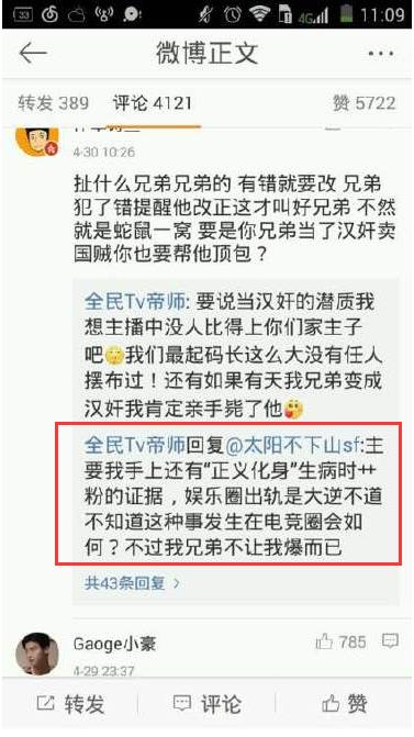 帝师:主要我手上还有“正义化身”生病时艹粉的证据,娱乐圈出轨就是大逆不道不知道这种事发生在电竞圈会如何?不过我兄弟不让我爆而已。