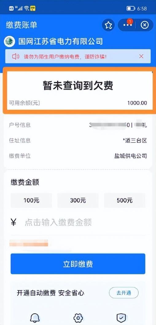 4、此账号显示:暂未查询到欠费,可用余额(元):1000.00。如果要缴费,则在¥后点击输入缴费金额,再点击立即缴费;