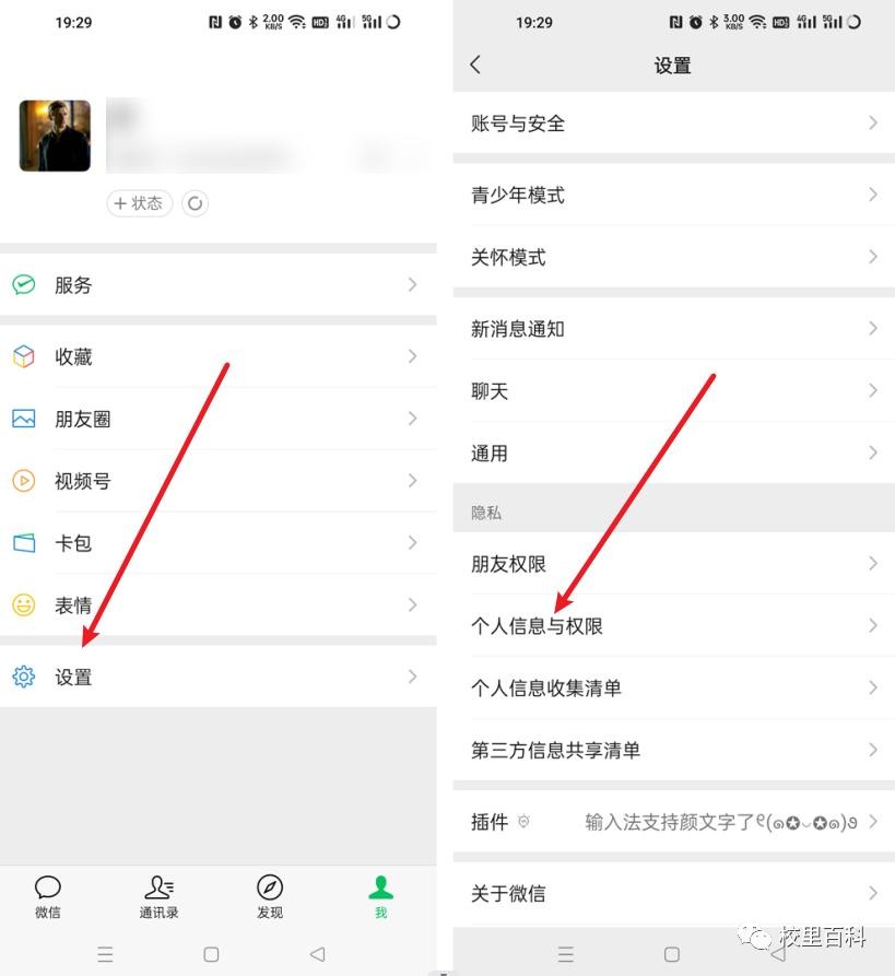 1、打开我们微信,在底部的【我】中点击【设置】,接着找到并点击【个人信息与权限】;