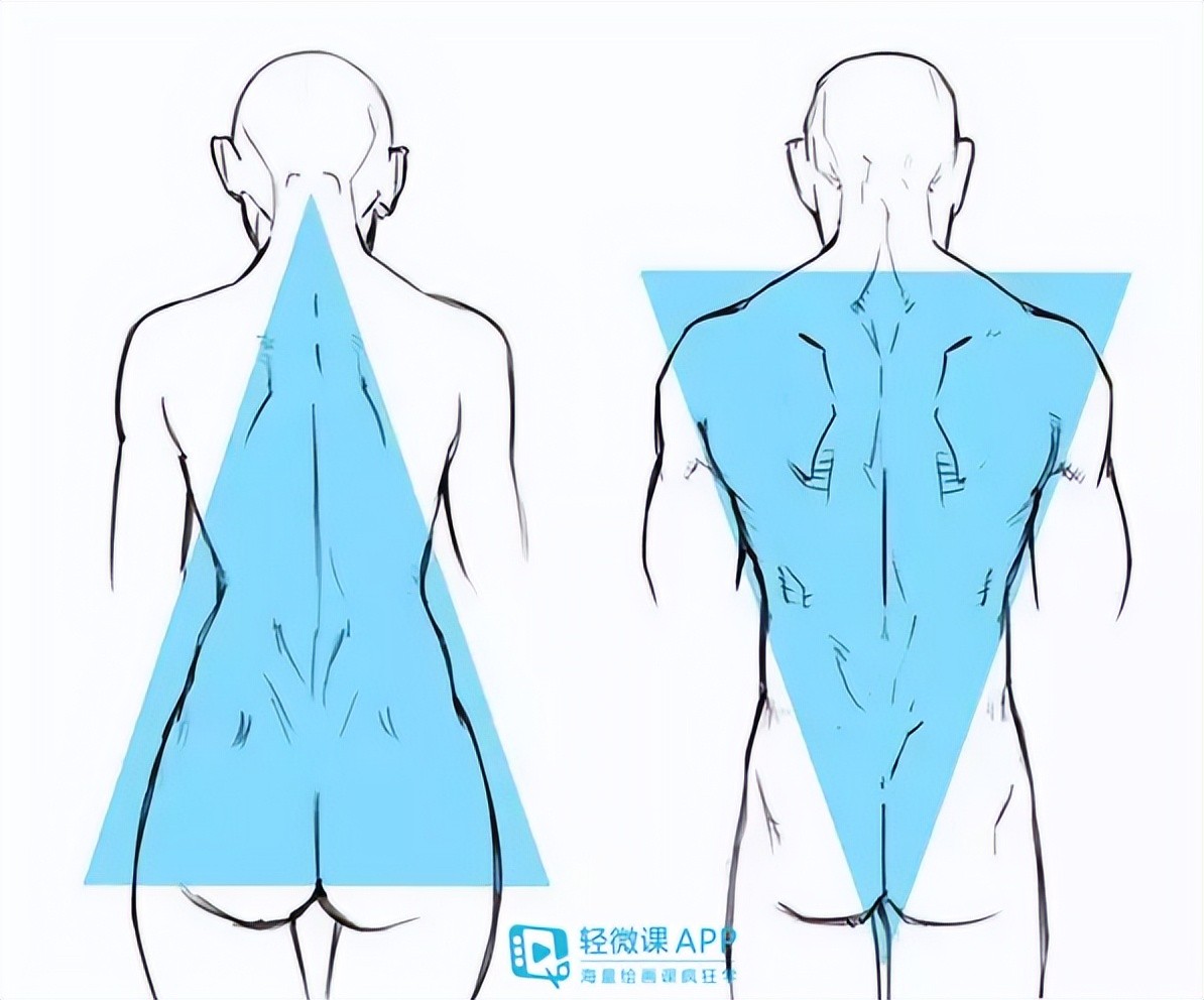 在画日系插画人物时,我们可以先绘制两条从肋骨出发,止于骨盆中心结束的线,再绘制两条从骨盆出发,到颈部结束的线条,那么线的交叉处,则与女性的腰围一致。男性则稍下移,腰宽比臀宽稍微窄小一点。男性的躯干支架呈倒等腰三角形,女性躯干支架呈等腰三角形。