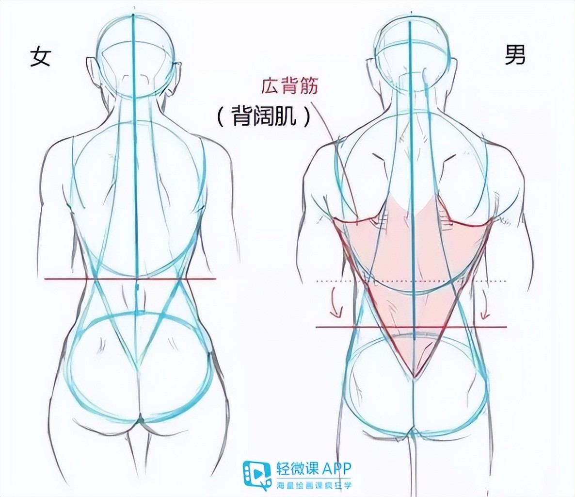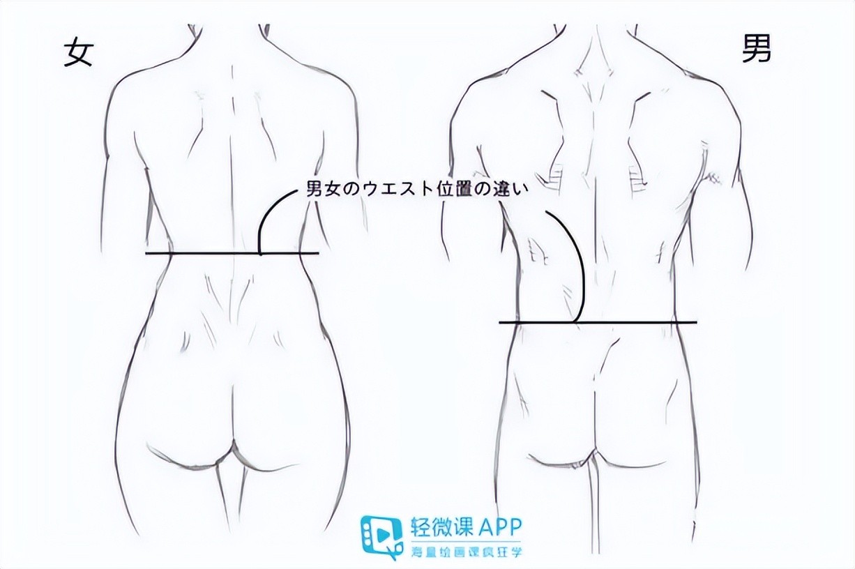 女性的胸骨和骨盆的间距较大,因此腰部活动范围广,更柔软灵活;又因胸骨整体较小,胸骨下方窄,腰部最细的位置会比肘部稍低一些,“S”型。而男性的胸骨和骨盆的间距较小,肌肉更明显,因而活动范围窄,线条更硬一些;又因胸骨整体较大,胸骨下方较宽,腰部最细的位置更低于肘部,几乎与肚脐眼平齐。简单来说呢,男性肩宽腰窄,女性腰细胯宽,且女性的腰线要比男性的腰线高。