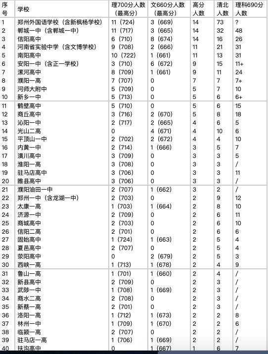 另有十几所高中仅有一个清北,如郑州北大培文学校等,具有较大偶然性,整体高分人数极少,甚至有些有较大争议(或复读生或郸城培养等),不能代表学校整体水平很高。