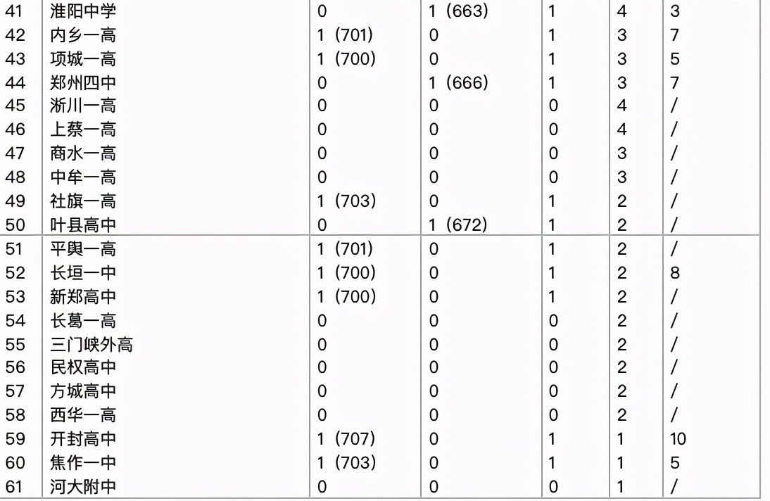 入围高中标准:清北录取人数至少2人以上,共58所高中入围。另补充开封高中、焦作一中两所地市最好高中和河大附中省属传统强校(河大附中整体水平高于其余高中,但今年高分数据实在太差)。共61所高中进入排序。