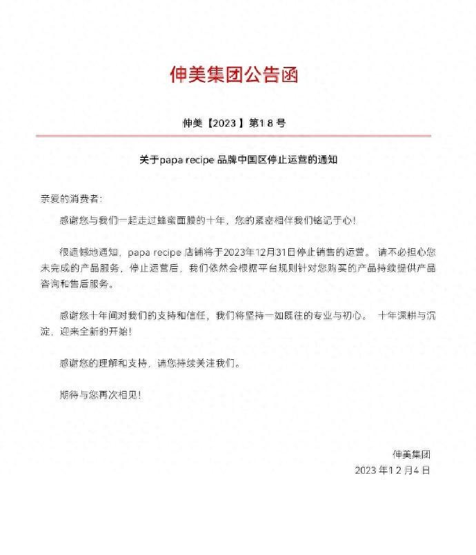 “感谢您与我们一起走过蜂蜜面膜的十年......期待与您再次相见!”近日,伸美集团发布通知称,韩妆品牌春雨将于2023年12月31日停止运营。潇湘晨报·晨视频记者经检索发现,春雨papa recipe天猫旗舰店、拼多多、京东、抖音、小红书等官方店铺渠道,均发布了停止运营的公告。