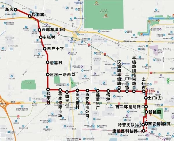 去程由新店始发,经三桥新街、后卫寨环岛、天章大道、天台路、沣东大道、红光路、丰镐西路、西二环、唐延路、大寨路、沣惠南路至唐延路科技路口;回程由唐延路科技路口始发,经沣惠南路、科技路、唐延路、西二环、丰镐东路、丰镐西路、红光路、沣东大道、天台路、后卫寨环岛、三桥新街至新店。线路长15.5公里,首班6:00,末班20:30,实行无人售票空调车投币两元可刷卡票制。