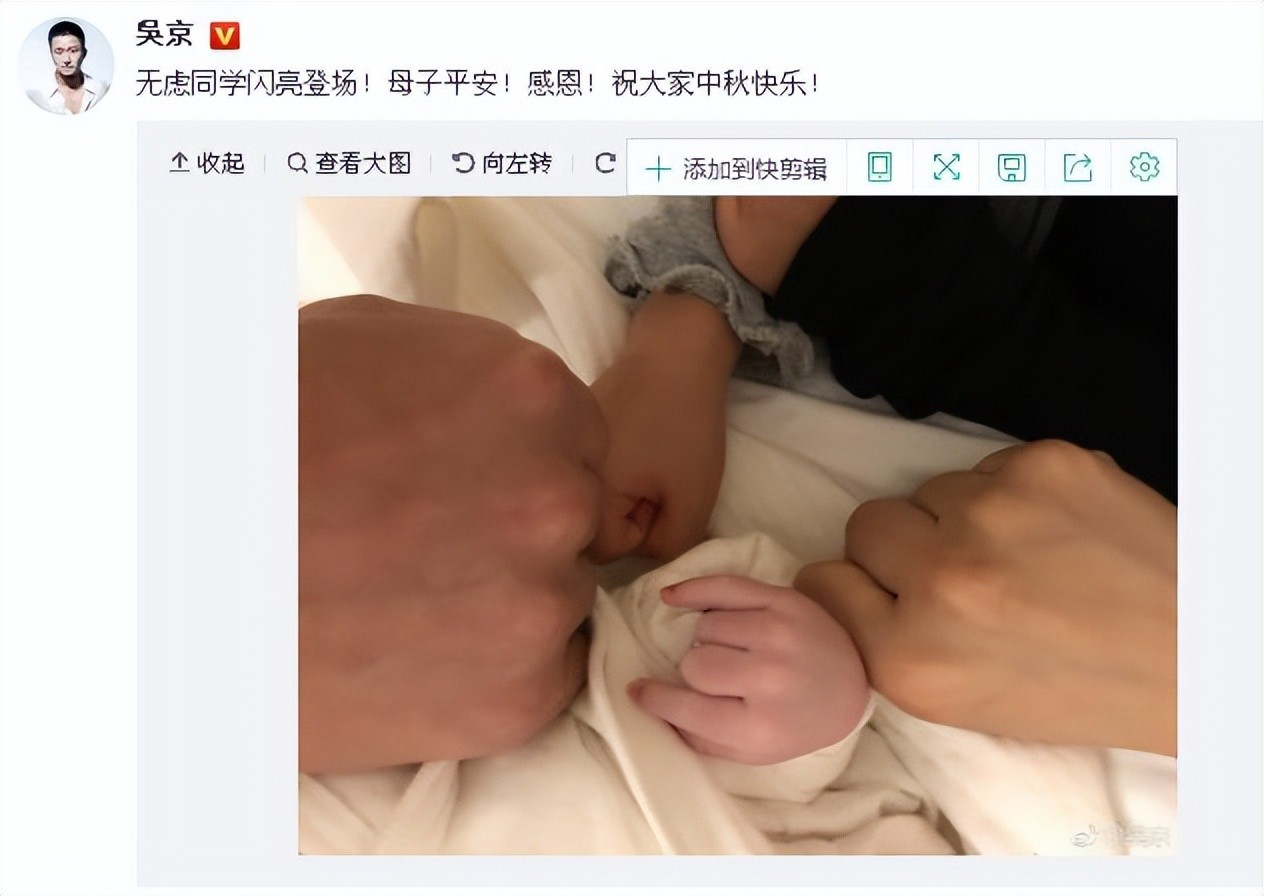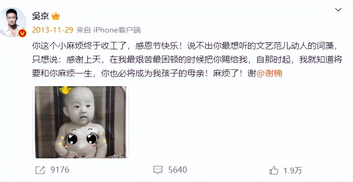 而吴京也不是孤独一人,2013年吴京公开示爱,发文对谢楠说:“你必将成为我孩子的母亲”