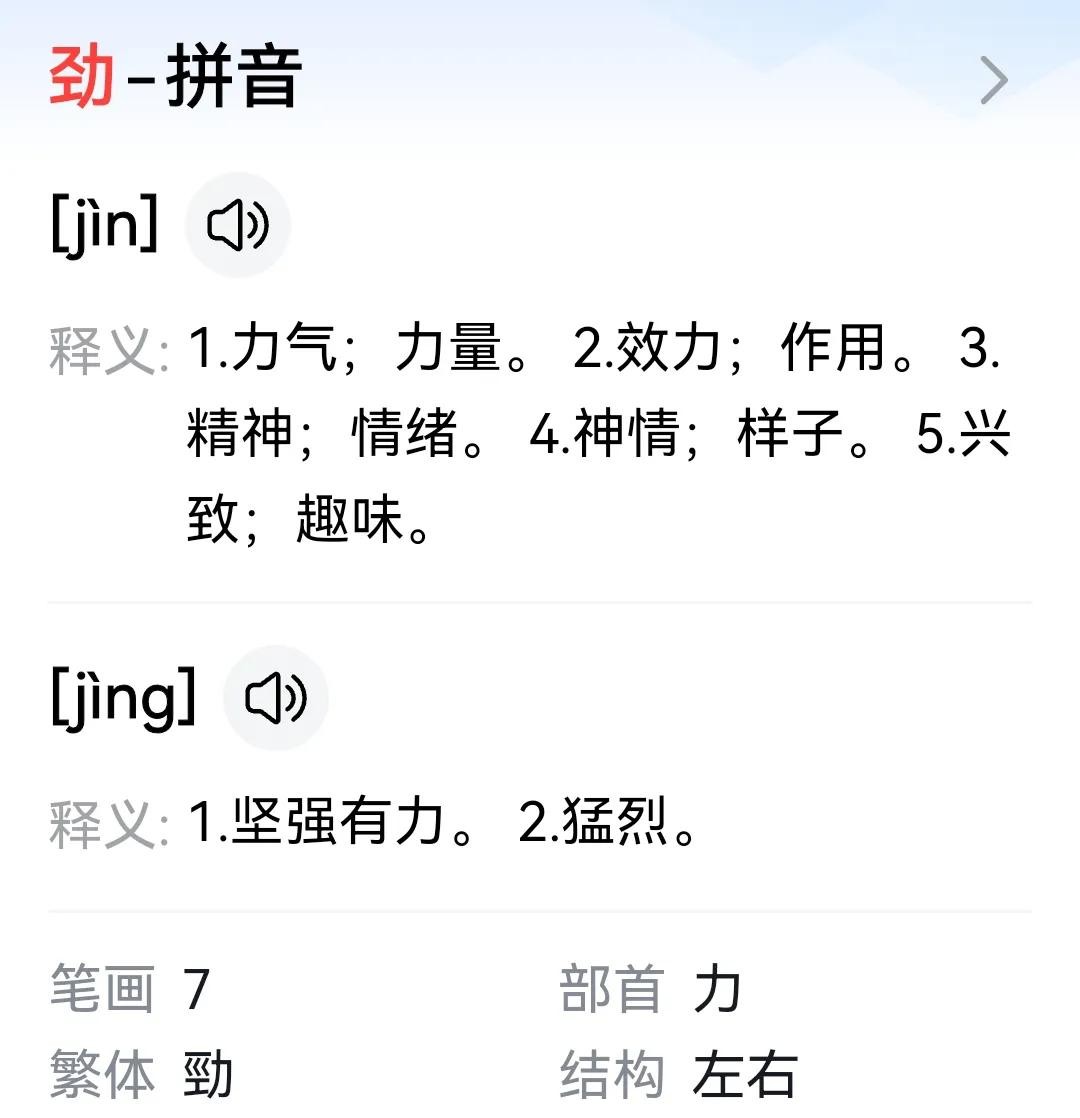 “劲”发音“jing”为“有力量”的意思,常见的词语有:苍劲、遒劲、劲敌、劲旅……