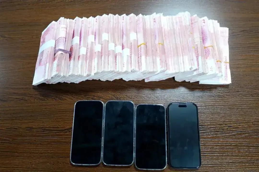 在5名嫌疑人身上共缴获22万余元现金和四部苹果手机。