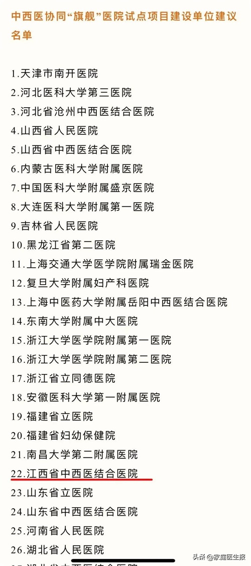 2023年5月国家发改委、国家卫健委、国家中医药局联合发布了《关于中西医协同“旗舰”医院试点单位和试点项目建设单位建议名单的通知》,全国12家医院获批试点单位,50家医院获批试点项目建设单位。江西省中西医结合医院(南昌市中心医院老福山院区)获批中西医协同“旗舰”医院试点项目建设单位,为江西省两家入选医院之一。