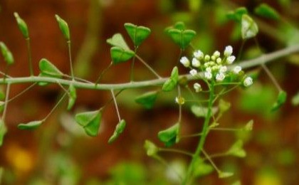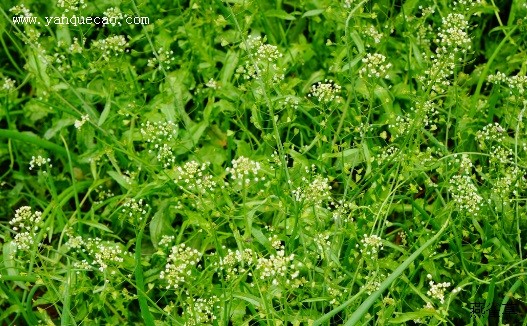 花多数,顶生成腋生成总状花序,开花时茎高20~50厘米,总状花序顶生和腋生。花小,白色,两性。萼4片,绿色,开展,卵形,基部平截,具白色边缘,十字花冠。短角果扁平。花瓣倒卵形,有爪,4片,白色,十字形开放,径约2.5毫米;雄蕊6,4强,基部有绿色腺体;雌蕊1,子房三角状卵形,花柱极短。短角果呈倒三角形,无毛,扁平,先端微凹,长6~8毫米,宽5~6毫米,具残存的花柱。种子约20~25粒,成2行排列,细小,倒卵形,长约0。8毫米。花期3~5月。