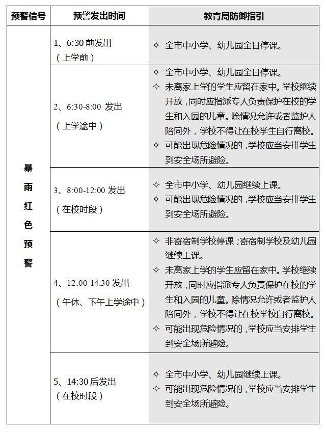那么问题来了,现在雨小了,还要不要停课?什么情况下停课?如果我已经在学校了呢?小编帮你查了一查,话不多说,上表~