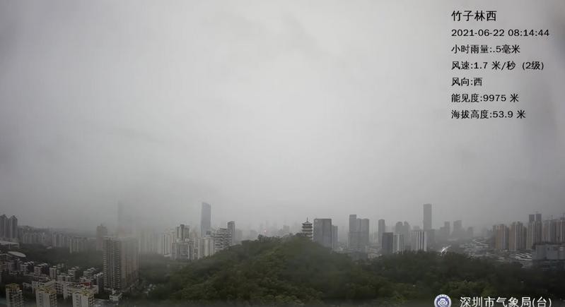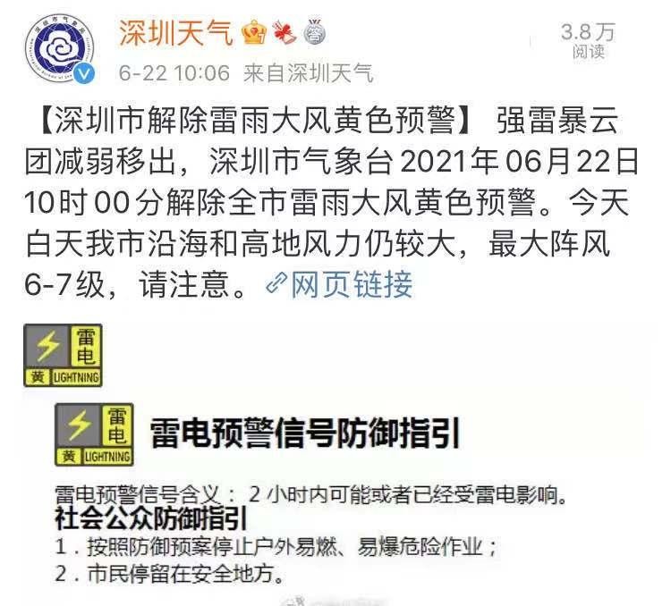 上午10:00强雷暴云团减弱移出,深圳市气象台2021年06月22日10时00分解除全市雷雨大风黄色预警。今天白天深圳市沿海和高地风力仍较大,最大阵风6-7级,请注意。