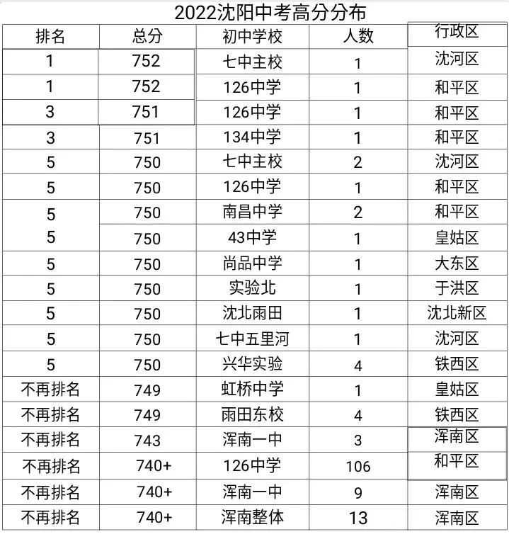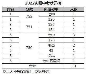 此表仅统计前13人,七中占据4个人,126中学3人,这样的成绩还算抢眼。目前已知沈阳750分以上的考生共有18人,像皇姑43中学、省实验北校、沈北雨田、兴华实验均有750分以上的考生。