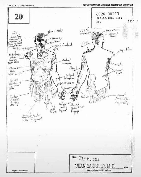 根据公布的事故报告可以得知,由于此次为空难事故,现场的细节太过惨状。据悉,当时科比等人所乘坐的私人飞机在坠毁后解体并充分爆炸燃烧,工作人员只能靠着DNA才能鉴定出每个遇难者的身份,其中也是包括科比和其二女儿gigi。而一张写着编号20的手绘画像,更是详细地画出了科比遇难后遗体的具体情况,通过这张画像可以看出科比身上遭遇了40处左右处的伤害,其中包含头部等多处致命伤。