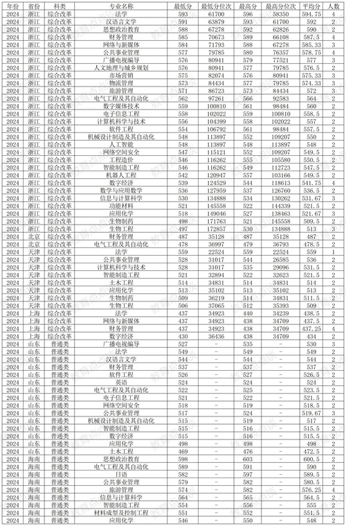 在浙江本科批录取分数线较高的专业:法学593分、汉语言文学591分、思想政治教育588分、财务管理585分、网络与新媒体584分、公共事业管理577分,最低的是生物工程497分,最低分位次172857。