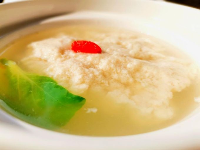 鸡豆花以鸡肉和火腿为原料,成菜形似豆花,质地滑嫩,汤清味鲜。初入口,便会让人感受到它细嫩口感,仔细品尝,才又从中尝出鸡肉的鲜美之感。更神奇的是,它的汤汁清澈见底,中无一物,“不似鸡肉,胜似鸡肉”。
